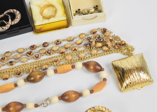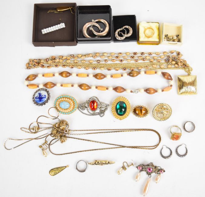 A 9ct gold wedding band (2g, size L), four pairs of silver earrings, silver ring, 9ct gold and silver eternity ring, brooches, etc