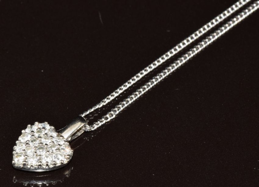 An 18k white gold pendant in the form of a heart set with diamonds (1.1 x 1.8cm) on an 18ct gold chain, 36cm, 6g