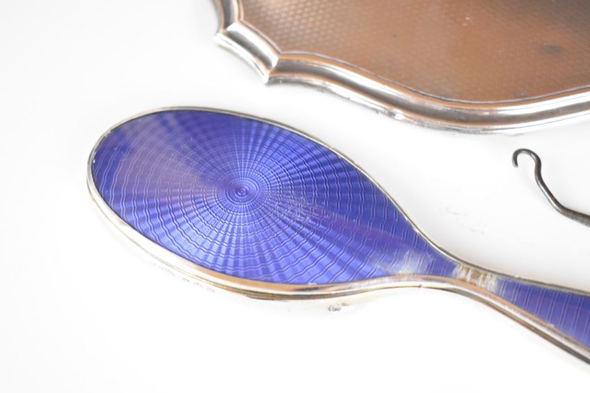 Hallmarked silver dressing table items comprising hand mirror, three brushes, button hook and two other silver handled tools together with a hallmarked silver and purple guilloche enamel brush back, length of longest 31cm