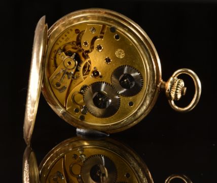 International Watch Co (IWC) 14ct gold keyless winding full hunter pocket watch with subsidiary seconds dial, blued hands, black Arabic numerals, gold dial and signed and movement, case diameter 51mm, serial number 814406, 83.2g.