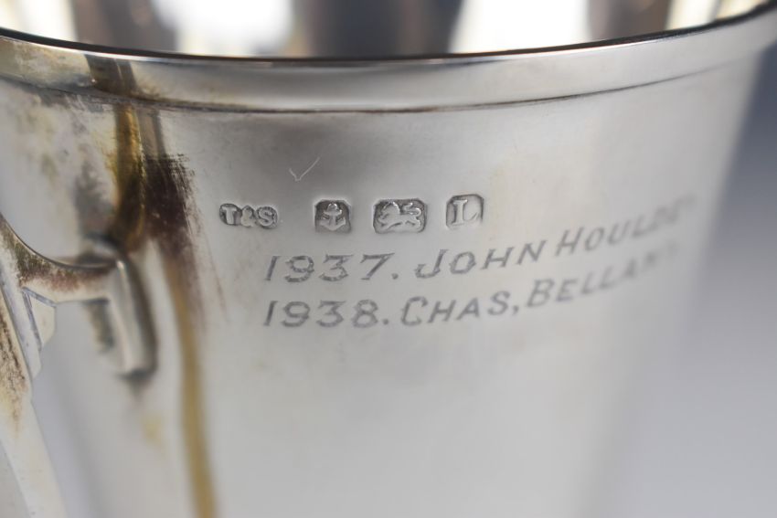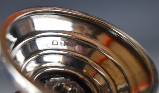 Art Deco hallmarked silver twin handled trophy cup with green marble or similar knop below the plain tapering cup, Birmingham 1935, maker Turner & Simpson Ltd, height 13cm, weight 216g all in