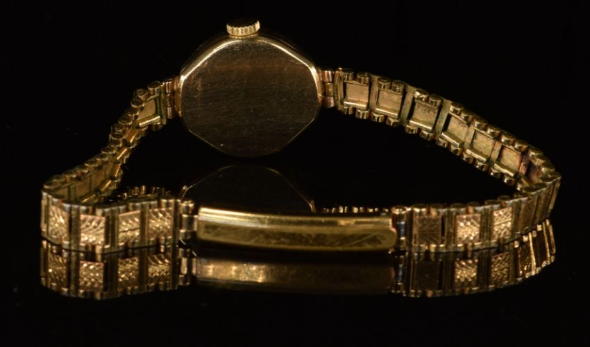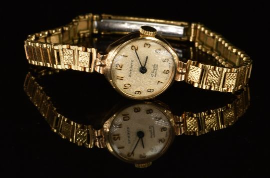 Two Everite 9ct gold ladies wristwatches, one with gold hands, black Roman numerals, white dial and quartz movement, on 9ct gold bracelet (17.5g) the other with black hands and Arabic numerals, silver dial and 17 jewel movement, on god plated bracelet, largest case diameter 18mm.