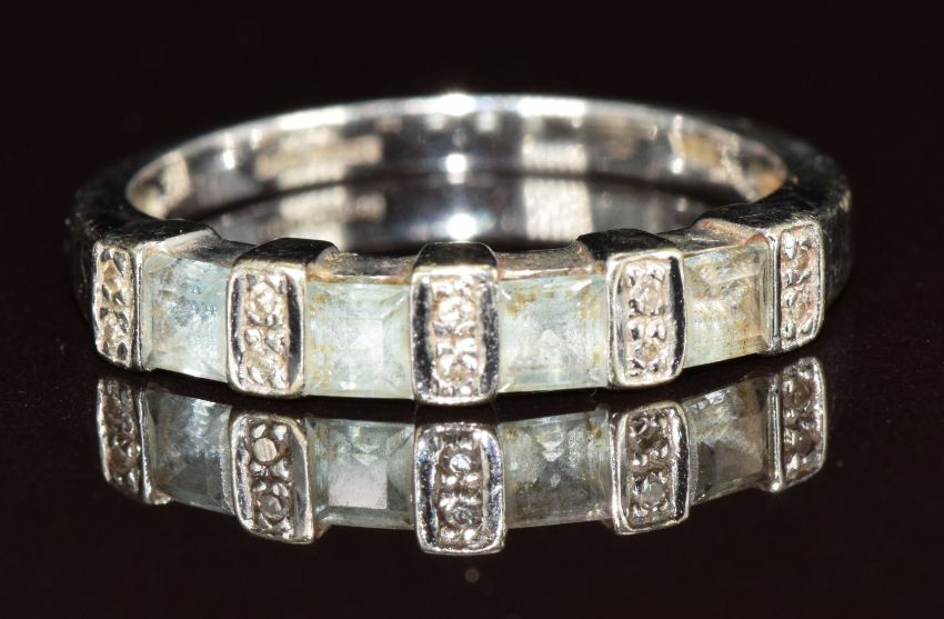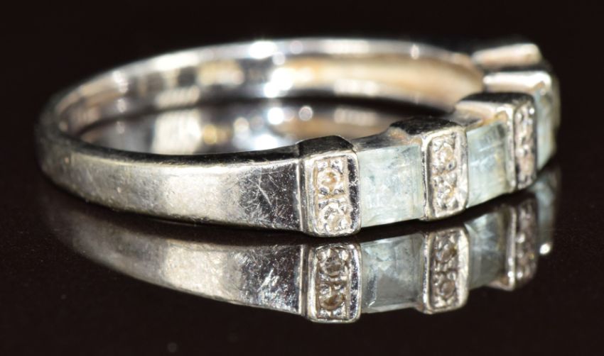 A 9ct white gold ring with aquamarines and diamonds, 2.6g, size P