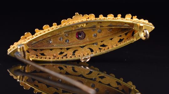 A 9ct gold c1900 brooch set with a ruby and old cut diamonds, 6.8g, 4.5cm
