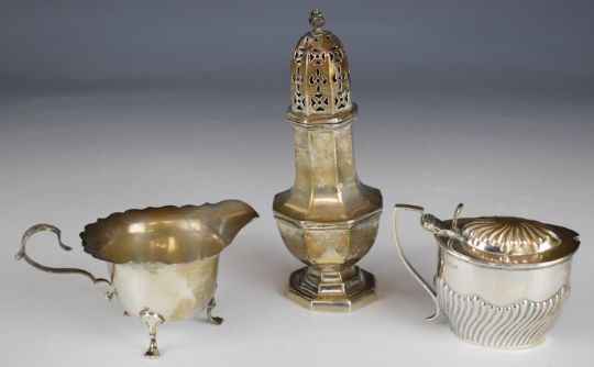 Hallmarked silver octagonal sugar caster, Birmingham 1909, maker Thomas & John Perry, Victorian hallmarked silver mustard, Sheffield 1896, maker W W Harrison & Co and a hallmarked silver jug, London 1911, maker Horace Woodward & Co Ltd, height of tallest 16.5cm, weight of all three excluding blue glass liner 222g