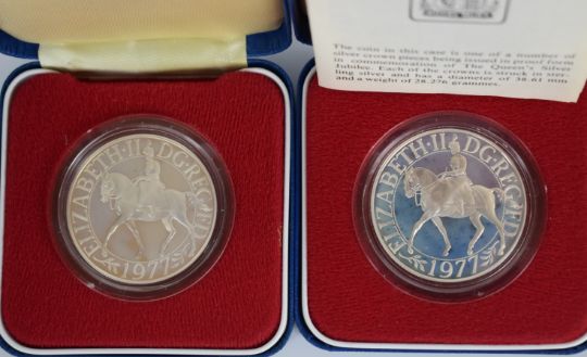 Five Elizabeth II silver proof 1977 Jubilee crowns, comprising three standard examples plus Mauritius and Tristan Da Cunha, all in original Royal Mint boxes, all but one with paperwork
