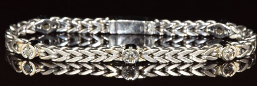 An 18ct white gold bracelet set with five round cut diamonds, each approximately 0.15ct, 29.4g, 19cm