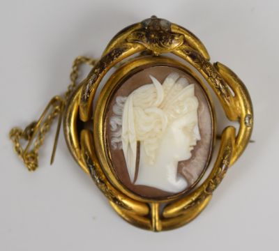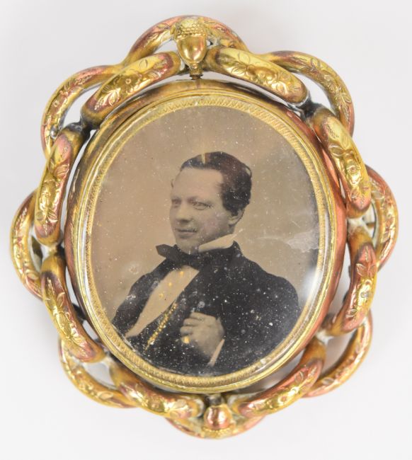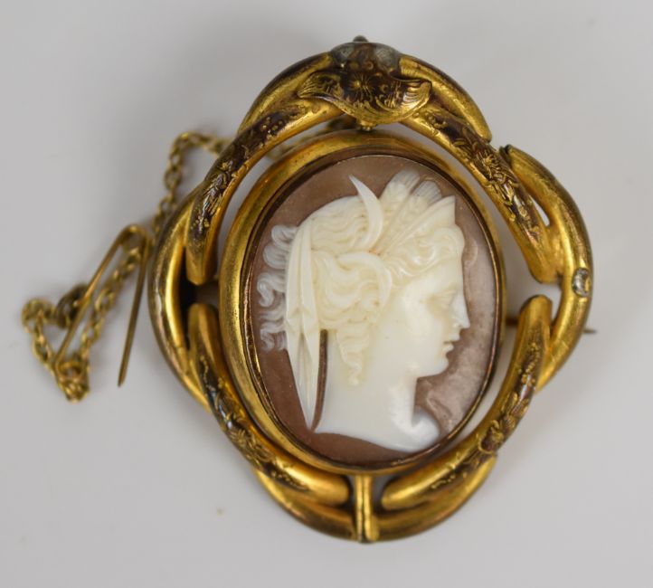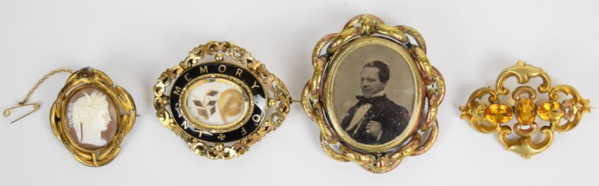 Victorian mourning brooch set with black enamel and hair and three other Victorian brooches