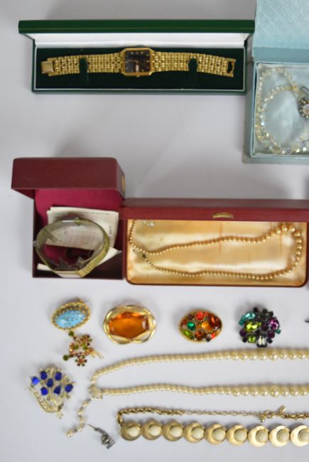 A collection of costume jewellery including Sphinx, Sarah Coventry, Miracle pendant, three silver RAF brooches, another silver brooch, 9ct gold locket (4.2g), etc
