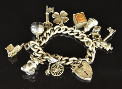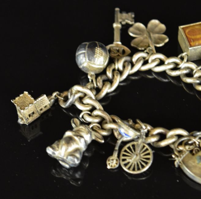 A silver charm bracelet with twelve charms including ten shilling note, four leaf clover, etc, 61g