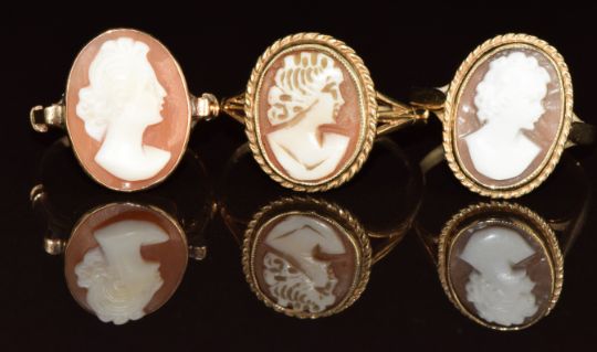 An 18ct gold ring (size M) and two 9ct gold rings, each set with a cameo, 7.2g, sizes O & S