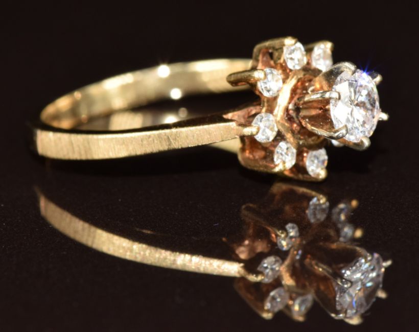 A 14k gold ring set with a round cut diamond of approximately 0.3ct, surrounded by further diamonds, 2.3g, size I