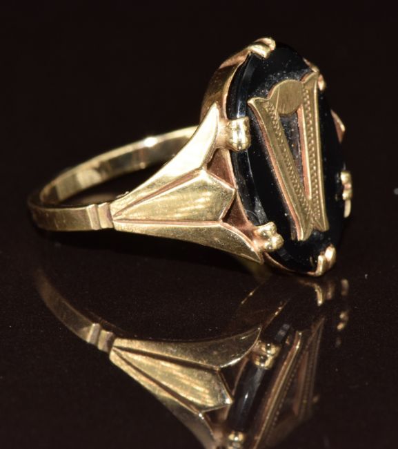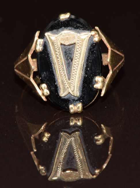 A 9ct gold ring set with onyx and a gold initial, 3g, size M