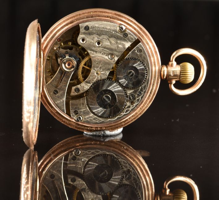 Waltham 9ct gold keyless winding full hunter pocket watch with subsidiary seconds dial, blued hands, black Roman numerals, white enamel dial and signed and engraved 7 jewel movement, case diameter 49mm, serial number 25690050, 92g.