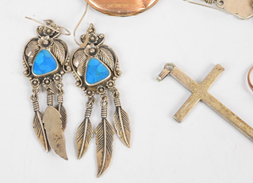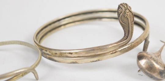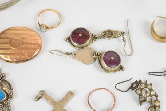 A silver serpent flapper bangle, a white metal serpent bangle, five pairs of silver/ white metal earrings, a silver cross, a pair of 9ct gold earrings, two 9ct gold rings (4.5g) and a 9ct gold back and front locket
