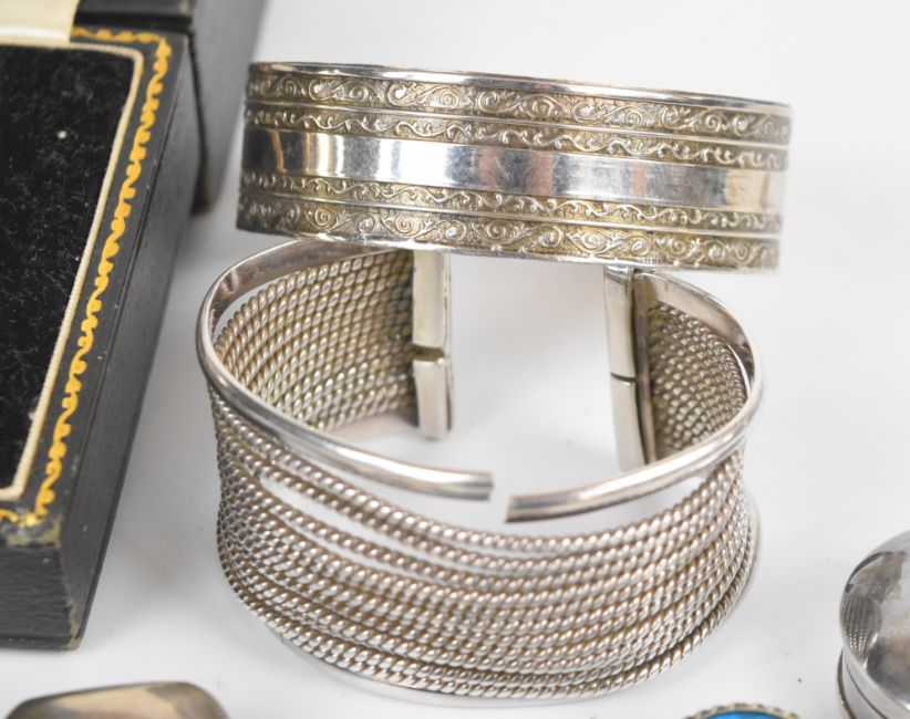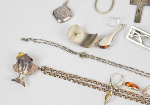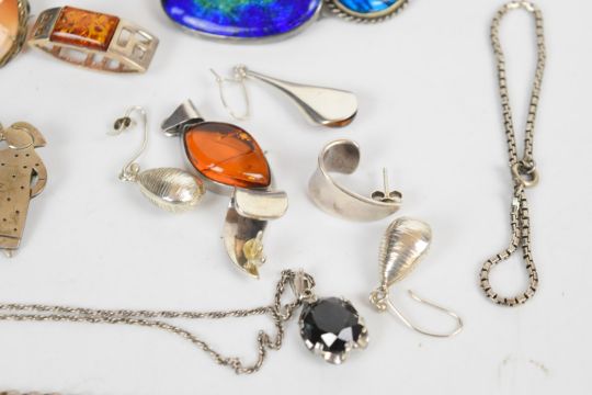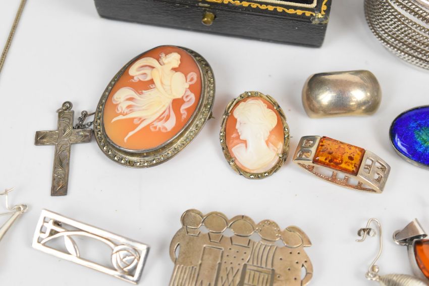 A collection of silver jewellery including pressed amber pendant and earrings, five chains, three pairs of earrings, three brooches, two bangles, cameo brooches, napkin ring in original box, pill pot and 1927 hallmarked brush