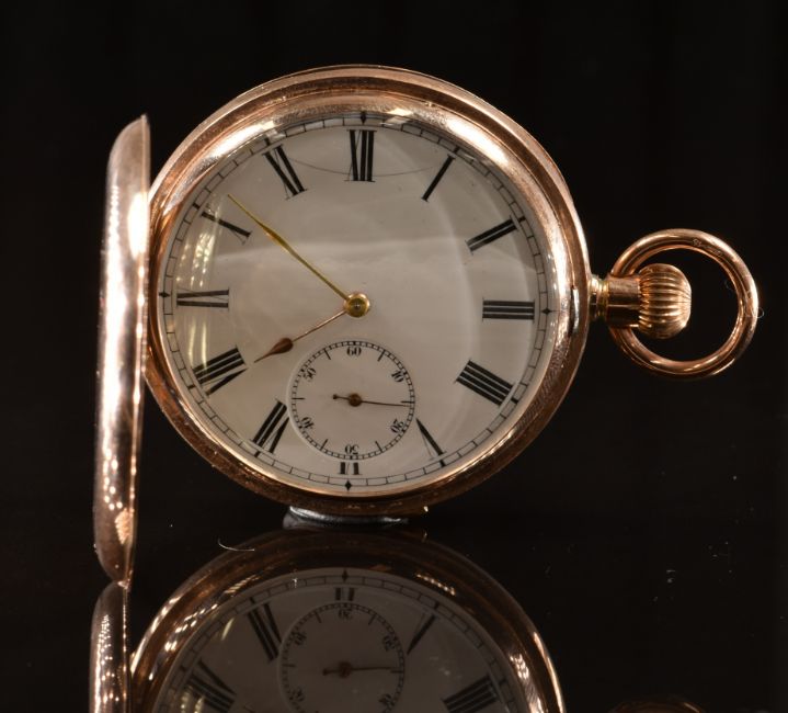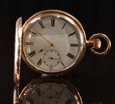 Swiss 9ct gold quarter repeating keyless winding full hunter pocket watch with inset subsidiary seconds dial, gold hands, black Roman numerals, white enamel dial and Swiss movement, case diameter 53mm, serial number 78018, 85.8g.