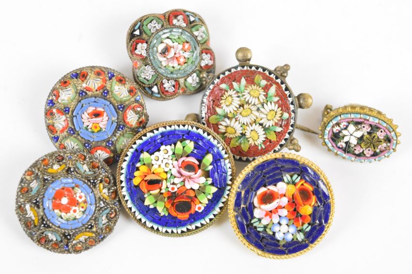 Sixty-one micro mosaic brooches including five bone examples