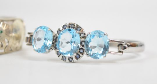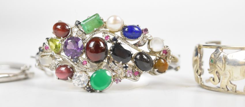 Three silver bangles including one in the form of elephants set with emerald eyes, one set with an emerald, moonstone, pearl, peridot, and garnet, etc, and one set with blue topaz and sapphires, together with a white metal bangle set with diamonds in heart shaped settings, 122g