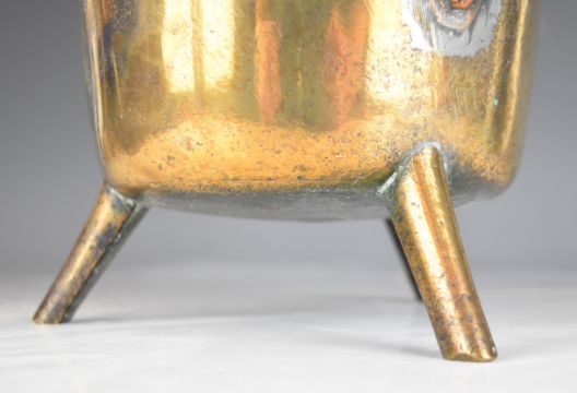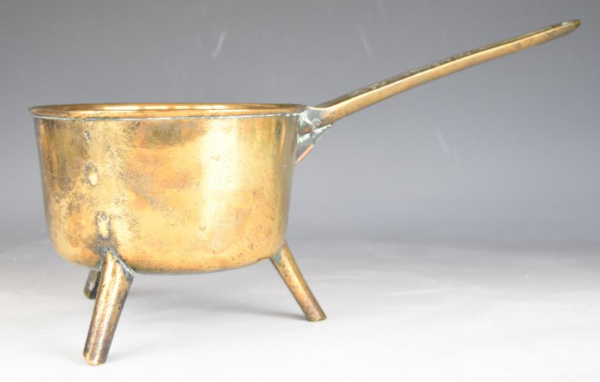 19thC bronze or similar saucepan with tripod base and 'Warner 4P' to handle, maximum height 21, diameter 18.5cm, width with handle 41.5cm