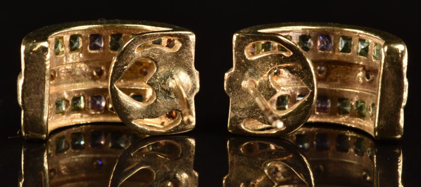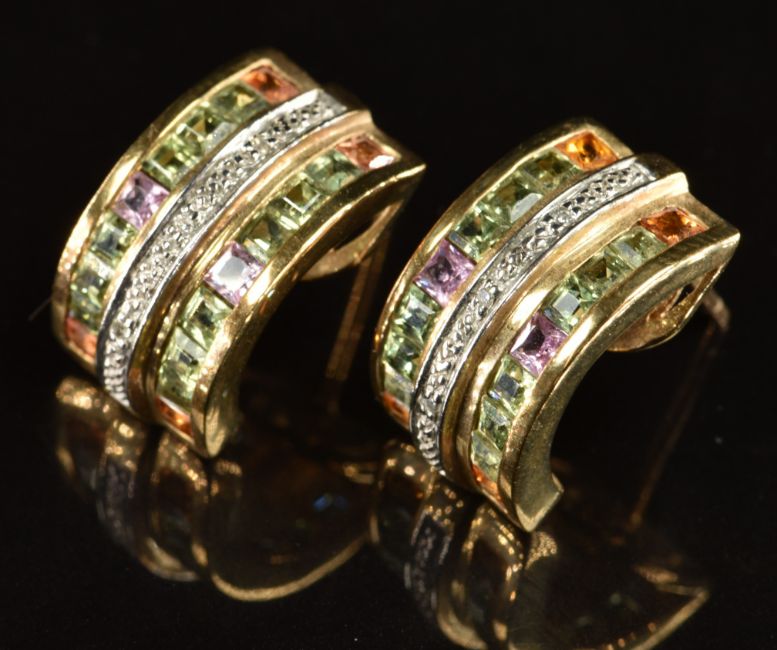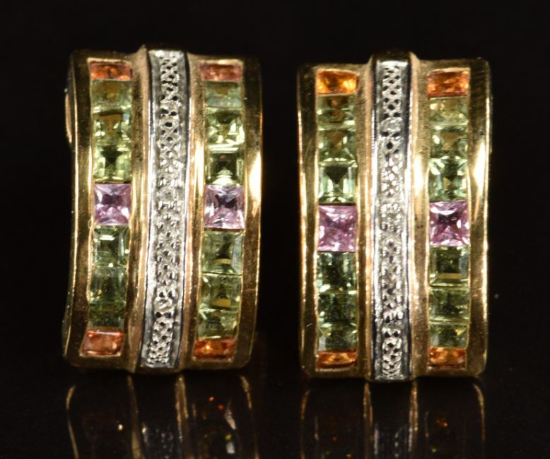 A pair of 9k gold earrings set with fancy sapphires and diamonds, 5.7g