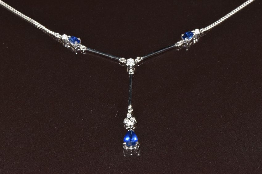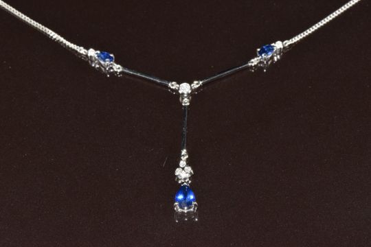 An 18ct white gold necklace set with three pear cut sapphires and diamonds, the total sapphire weight approximately 0.7ct, 5.9g