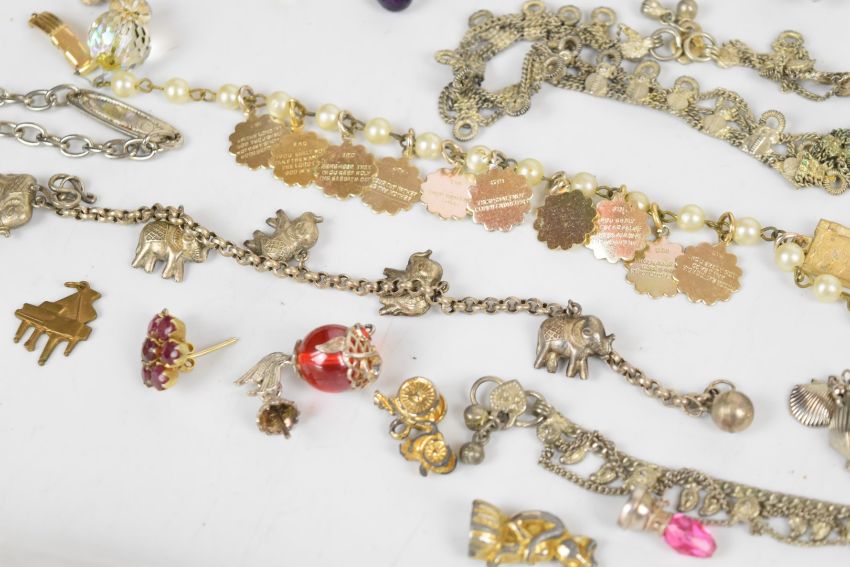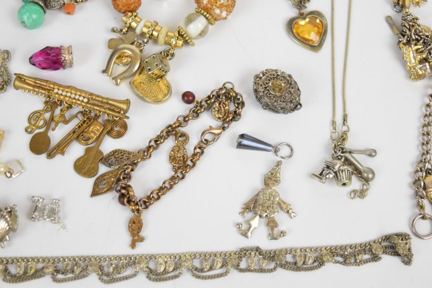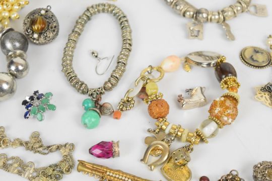 A collection of jewellery including nine silver charms, white metal charm bracelet, single ruby earring, section of pendant set with a sapphire and rubies, pair of earrings set with citrines, amethyst, topaz, sapphires, rubies and emeralds (one post needs repairing)