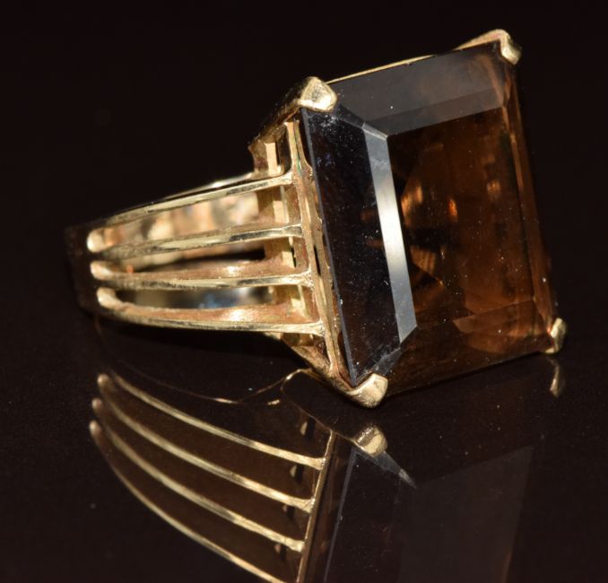 A 9ct gold ring set with an emerald cut smoky quartz, 9.5g, size O