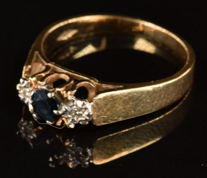 Two 9ct gold rings set with sapphires and diamonds (4.4g), a 9ct gold and silver eternity ring and a pair of 9ct gold earrings set with nephrite jade