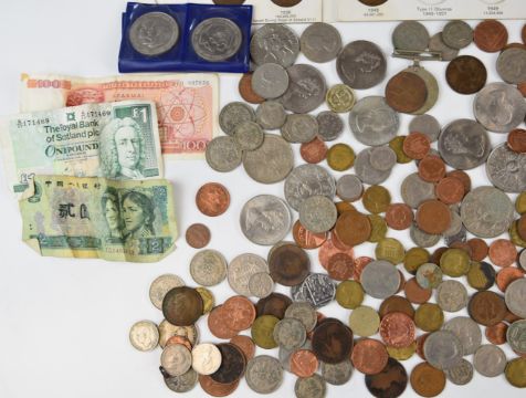 A quantity of UK coinage George III onwards, includes some sets, crowns, banknotes, redeemable examples, etc
