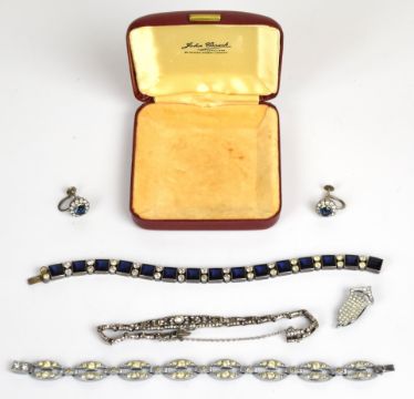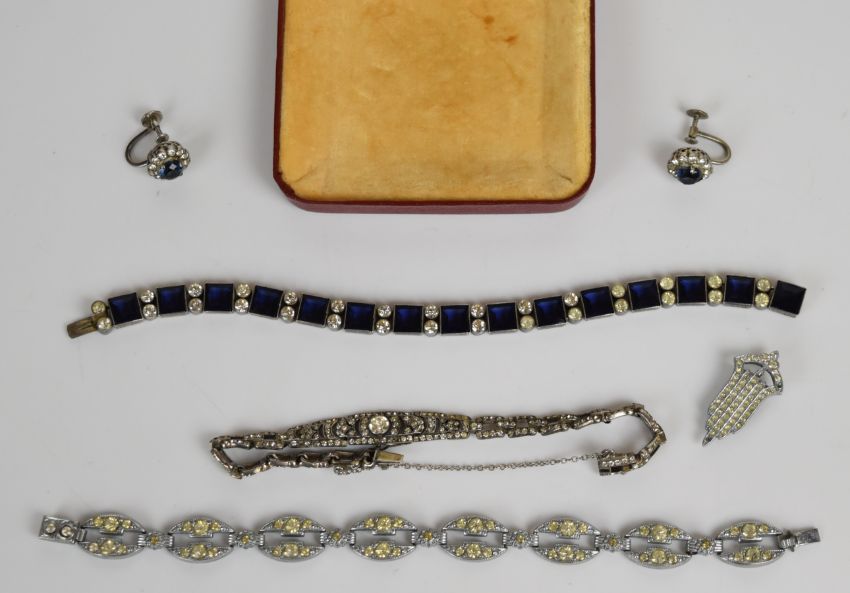 Art Deco bracelet, silver bracelet set with paste (Birmingham 1965), a pair of silver earrings and an Art Deco clip