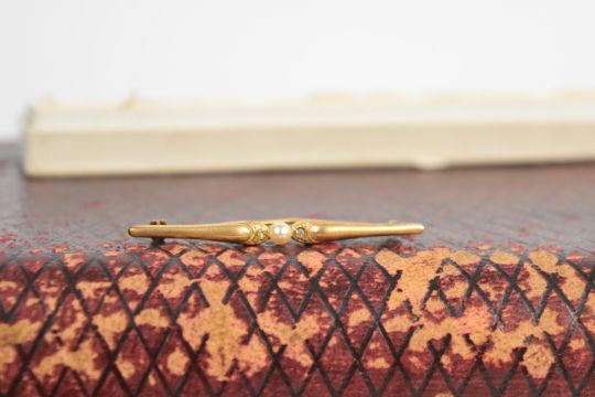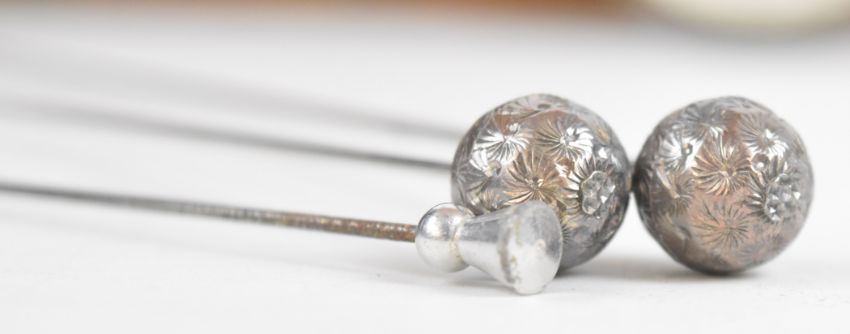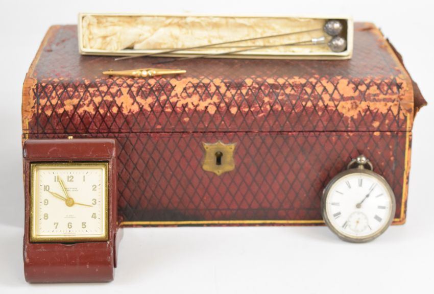A silver pocket watch, three hatpins including two with white metal tops, travelling clock and brooch