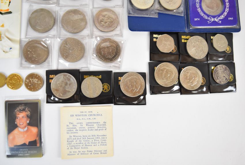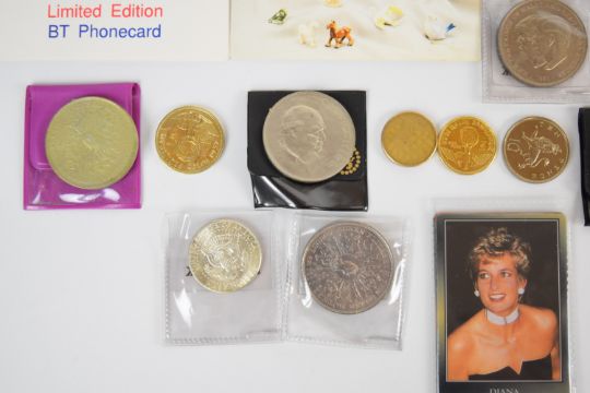 A collection of modern crowns etc, two gilt Nazi 1937 and 1938 coins comprising 5 Deutsches Reich and a 2 Deutsches Reich example, together with some phone cards including Apollo 11 25th Anniversary