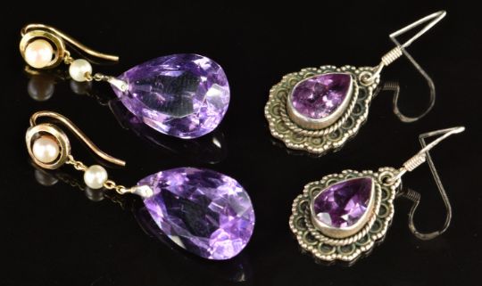 A pair of 9ct gold earrings set with pear cut amethysts and pearls (6.1g, 3.7cm) and a pair of silver earrings