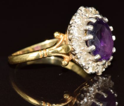 An 18ct gold ring set with an oval cut amethyst surrounded by diamonds, each diamond approximately 0.04ct, 5.8g, size O