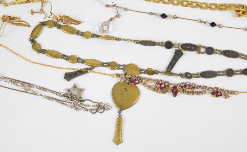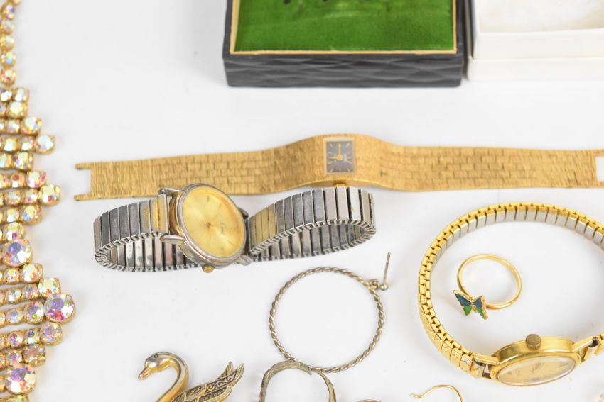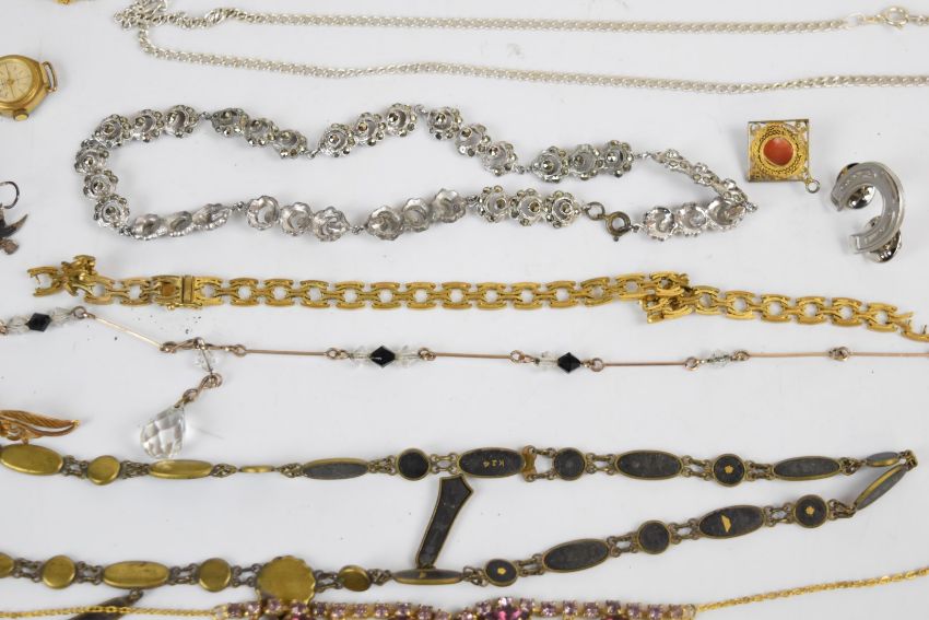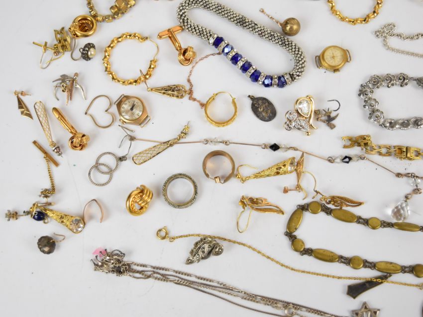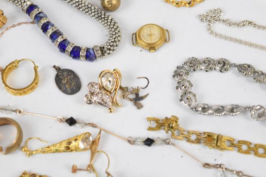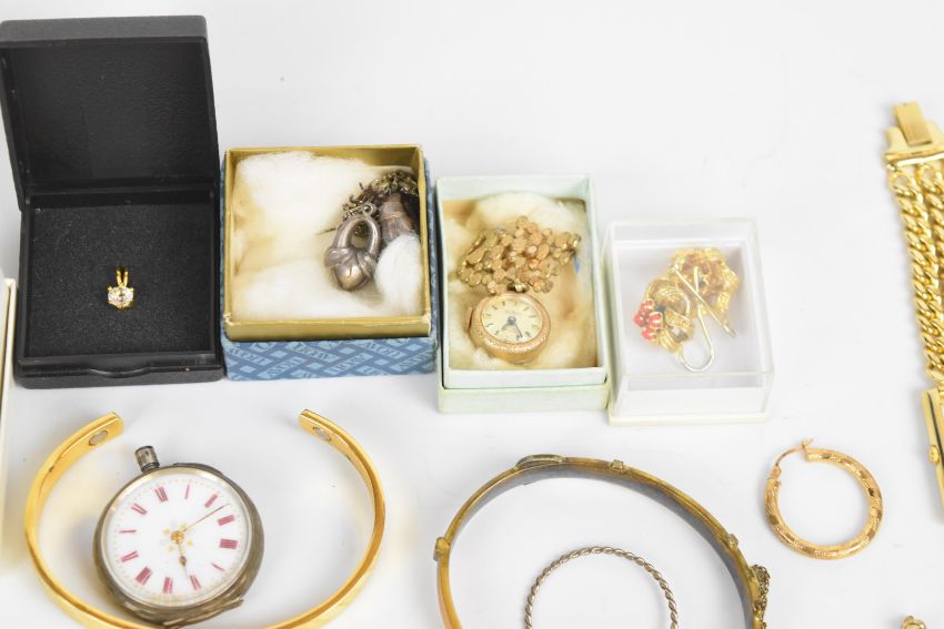 A collection of jewellery including silver fob watch, Japanese necklace, silver St Christopher, 9ct gold cased watch, silver chains, 18ct gold cased Borel watch, 9ct gold and silver eternity ring, single 9ct gold earrings (5g), etc