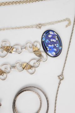 A collection of silver jewellery including fob watch, four chains, five pendants, necklace and brooch together with two Michaela Frey enamel brooches and costume necklace