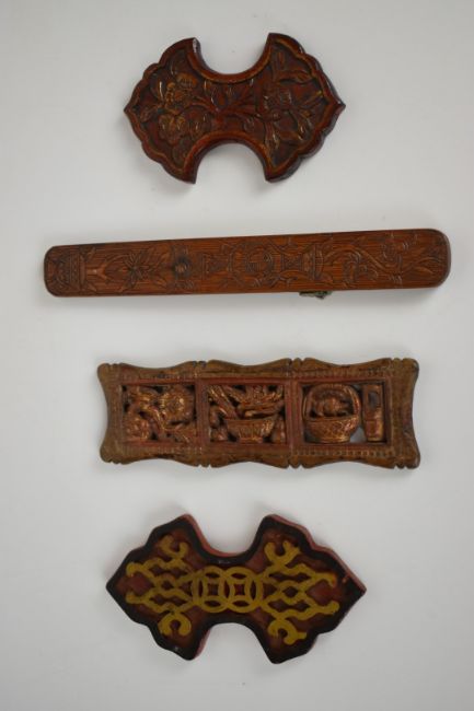 Embroidery / sewing interest carved Chinese / Asian winders and spacer, tallest 21cm