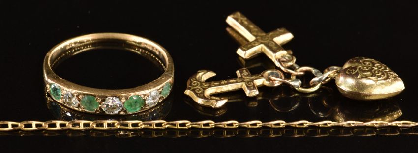A 9ct gold ring set with alternating emeralds and cubic zirconia (size M) and a 9ct gold pendant in the form of an anchor, cross and heart (love, faith and hope) on 9ct gold chain, 4.2g
