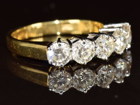 An 18ct gold ring set with five diamonds, each approximately 0.3ct, 4.5g, size N