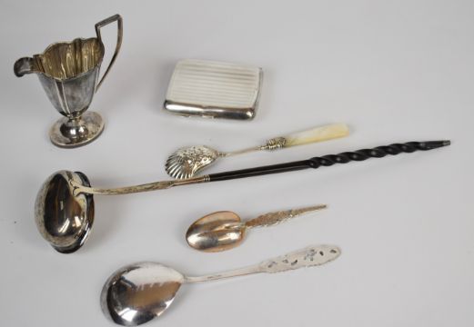 Hallmarked and other silver items comprising cigarette case, jug, anointing spoon, toddy ladle and spoon marked 830S, length of longest 36cm, together with a silver plated and mother of pearl serving scoop or caddy spoon, 241g weighable silver