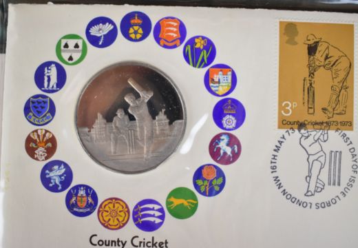 Eight John Pinches silver proof medallic first day covers comprising County Cricket 1873-1973, 1973 Royal Wedding, 1975 Turner Bicentenary, 1975 Railway Sesquicentennial and set of four Great Britons comprising Robert the Bruce, Owen Glendower, Henry V and Edward the Black Prince