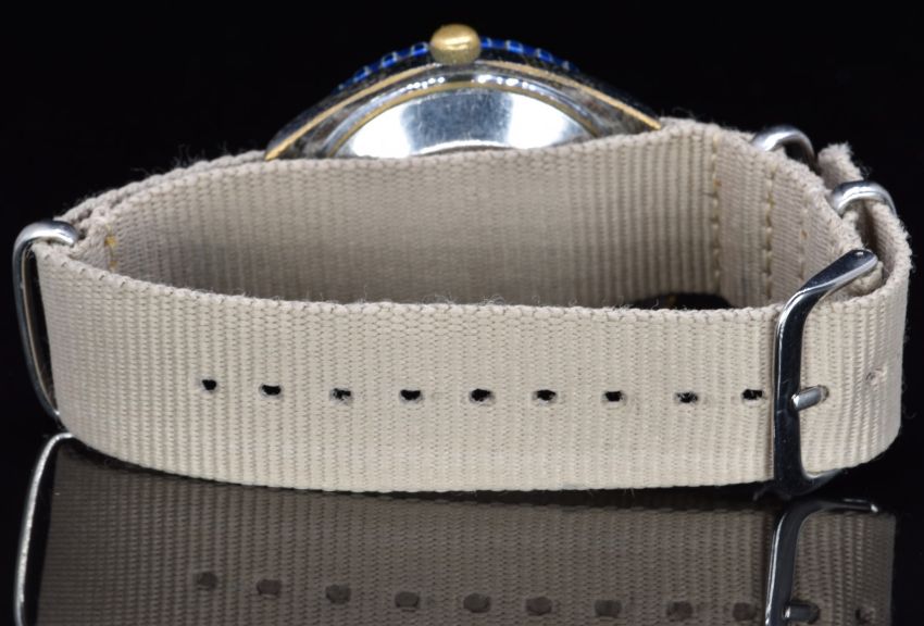 Sicura (Breitling interest) gentleman's skin diver's automatic wristwatch with date aperture, luminous hands, bevelled hour markers, silver dial, blue bezel, silver plated case and 25 jewel movement, on beige NATO style canvas strap, case diameter 40mm,