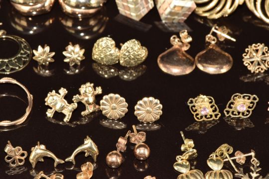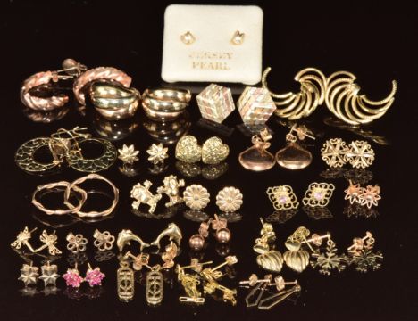 Twenty six pairs of 9ct gold earrings including hoops, tri-coloured, ruby cluster, hearts, flowers, stars, etc, 17g