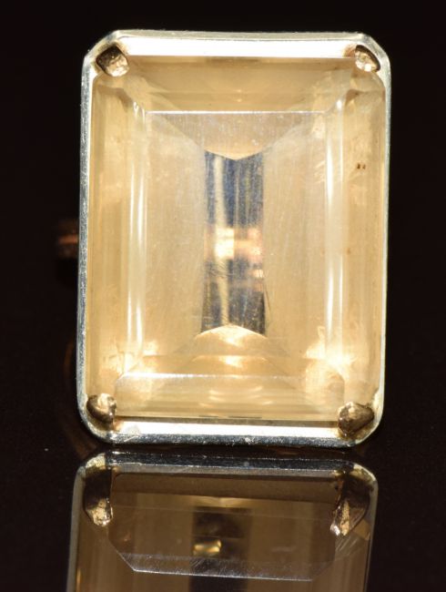 A yellow metal ring set with an emerald cut citrine, 9.4g, size M