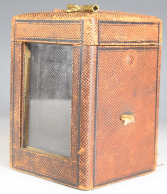 19th century brass cased repeating carriage clock with bevelled glass panels, striking on a gong, in original travel case, height of clock including handle 16.5cm