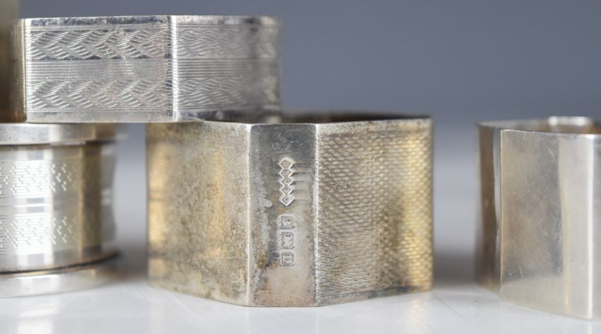 Nine various hallmarked silver napkin rings including engine turned examples and a triangular Art Deco style example, weight 190g