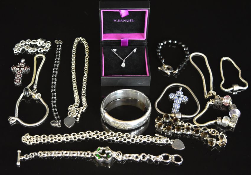 A collection of silver jewellery including ten bracelets, two cross pendants, two chains, bangle, earrings and necklace, 210g