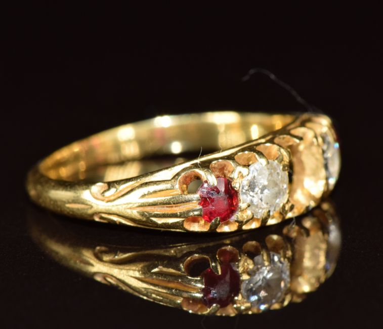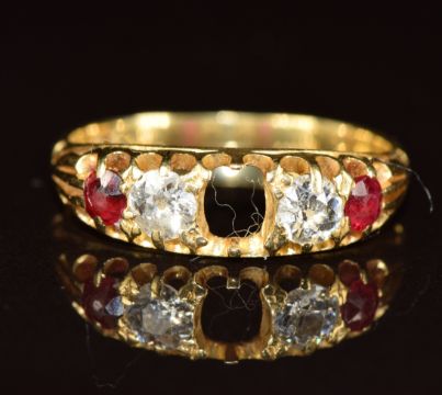 An 18ct gold ring set with rubies and diamonds, each diamond approximately 0.15ct (centre ruby missing), 2.6g, size L