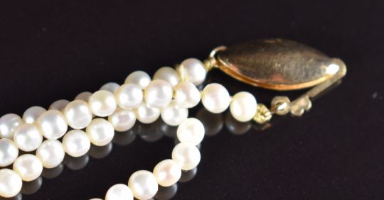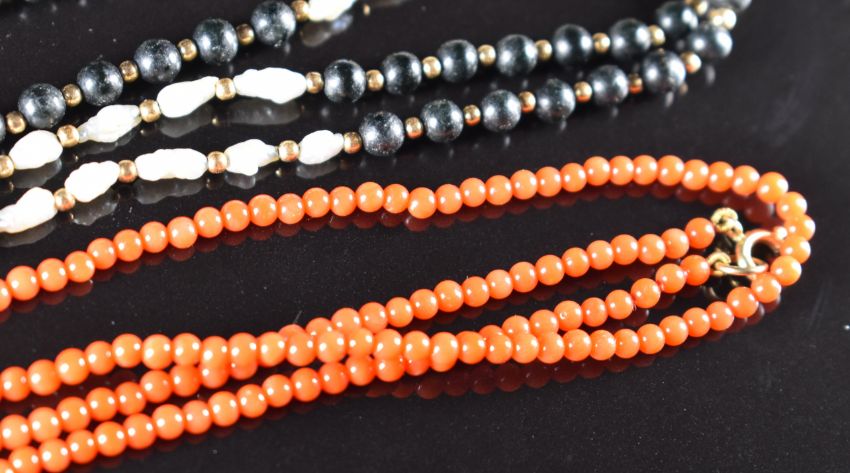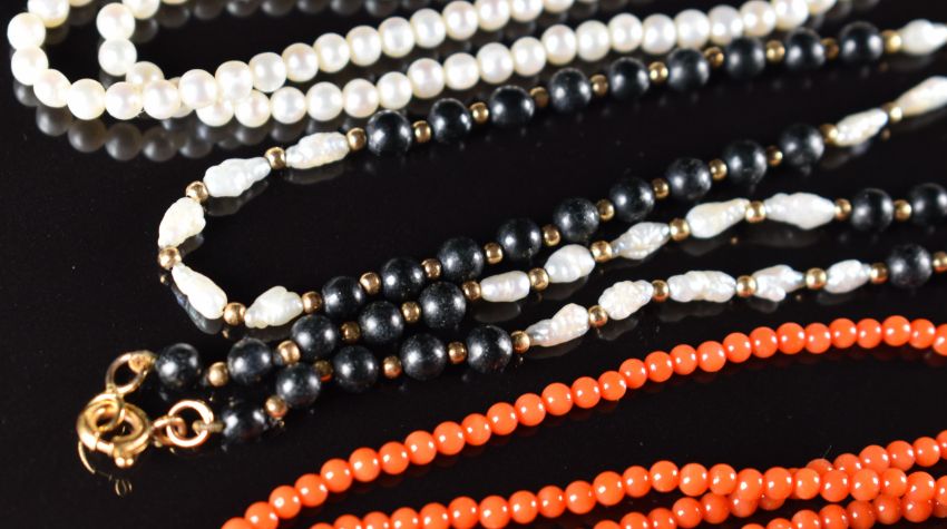 A coral necklace with 9ct gold clasp, onyx and pearl necklace with 9ct gold clasp and a strand of cultured pearls with 14k gold clasp